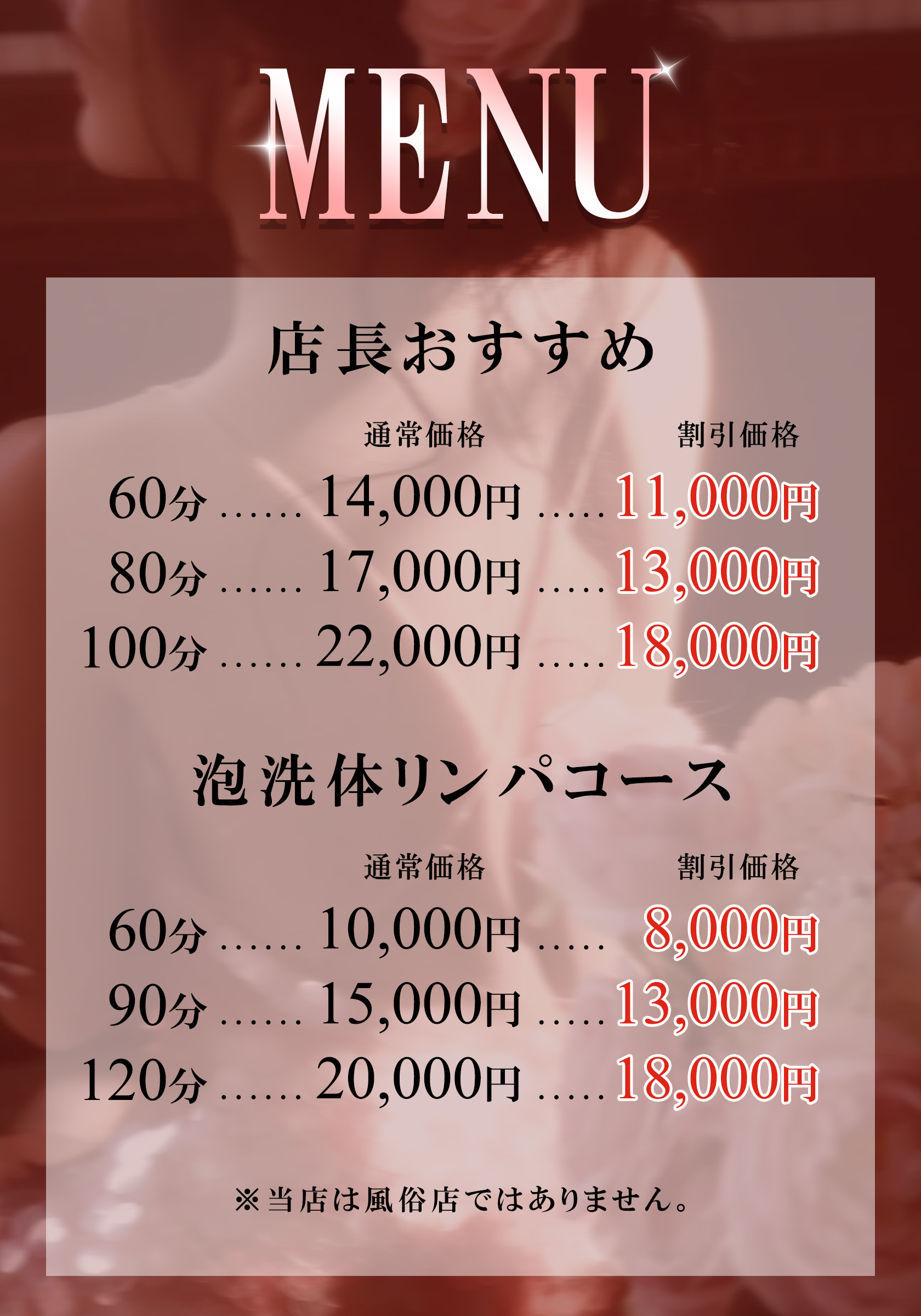 毎日頑張っている紳士の皆様、日頃の疲れになっている身体と心を、幸福なる雰囲気包まれた癒しの場所、落ちついた部屋の個室で可愛いセラピスト達がお待ちしております。当店のセラピストは若く容姿端麗にこだわりました、まるで蜜のように甘く幸せな空間でゆったりとした時間をお過ごし下さい。